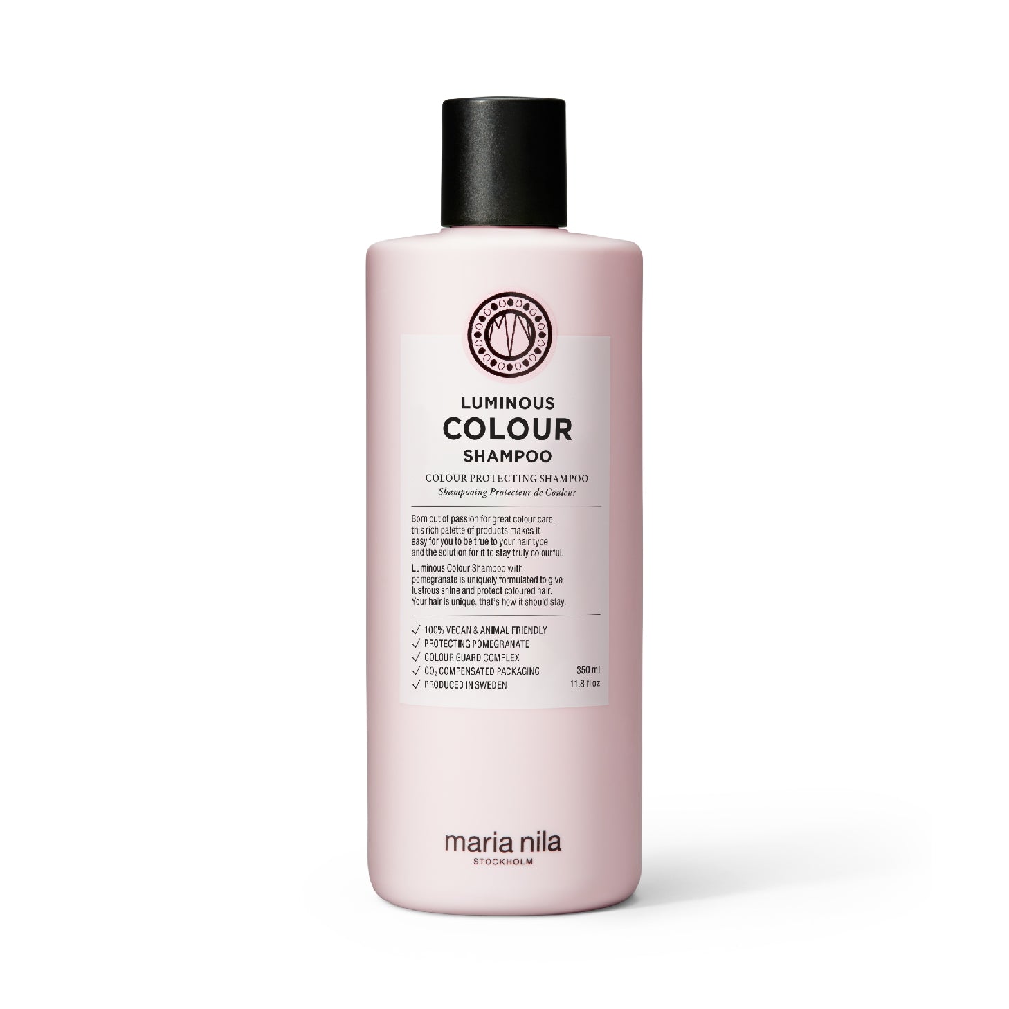Maria Nila Luminous Colour Shampoo är ett shampo för färgat hår som bygger upp, stärker hårets struktur och tillför glans. Granatäppleextrakt och Colur Guard Complex reducerar färgförlusten som uppstår vid tvätt, värmestyling och skyddar håret mot uv-strålning samt fria radikaler. Luminous Colour Shampoo har en fruktig doft av äpple, björnbär och persika.